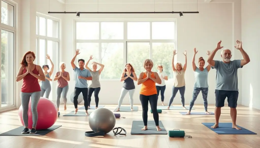 1. Yoga sessions blending flexibility exercises for seniors with strength moves for younger members